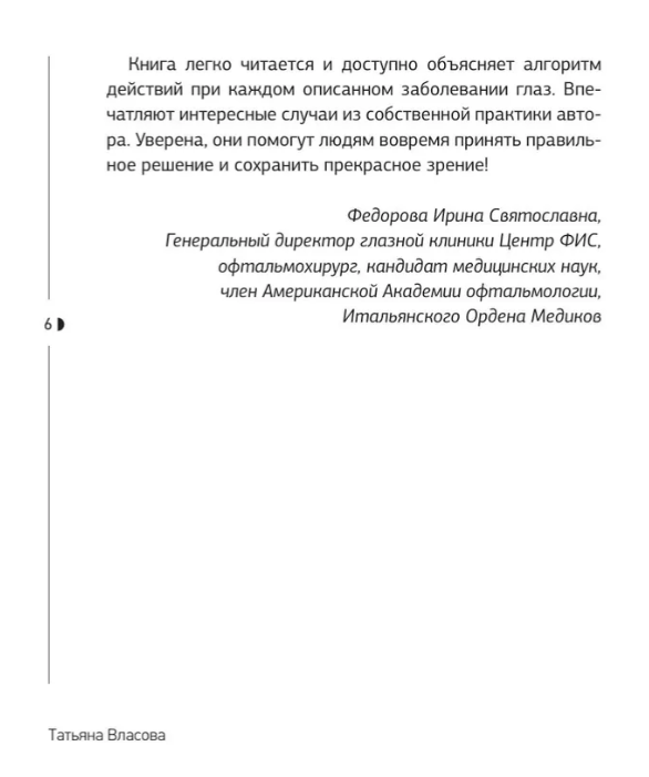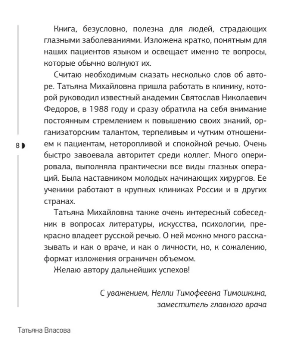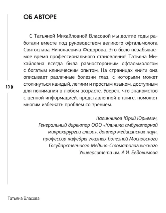 Татьяна Власова – офтальмолог со стажем более 30 лет, из которых 16 лет проработала в МНТК "Микрохирургия глаза" бок о бок с профессором Святославом Федоровым и присутствовала при разборах самых сложных случаев на всех консилиумах.