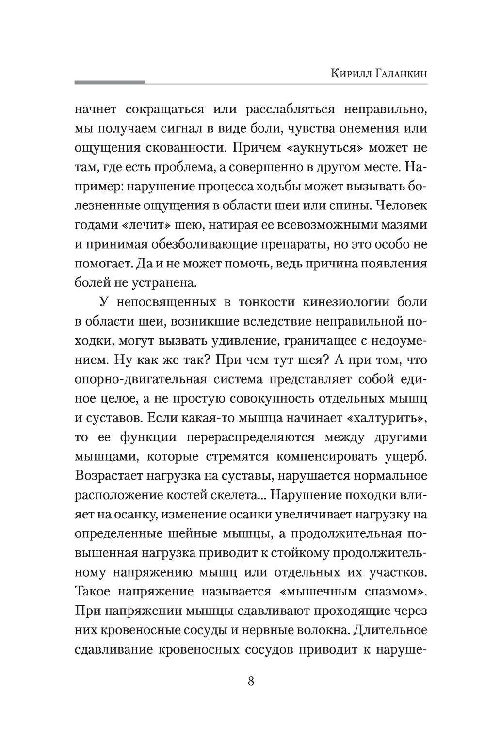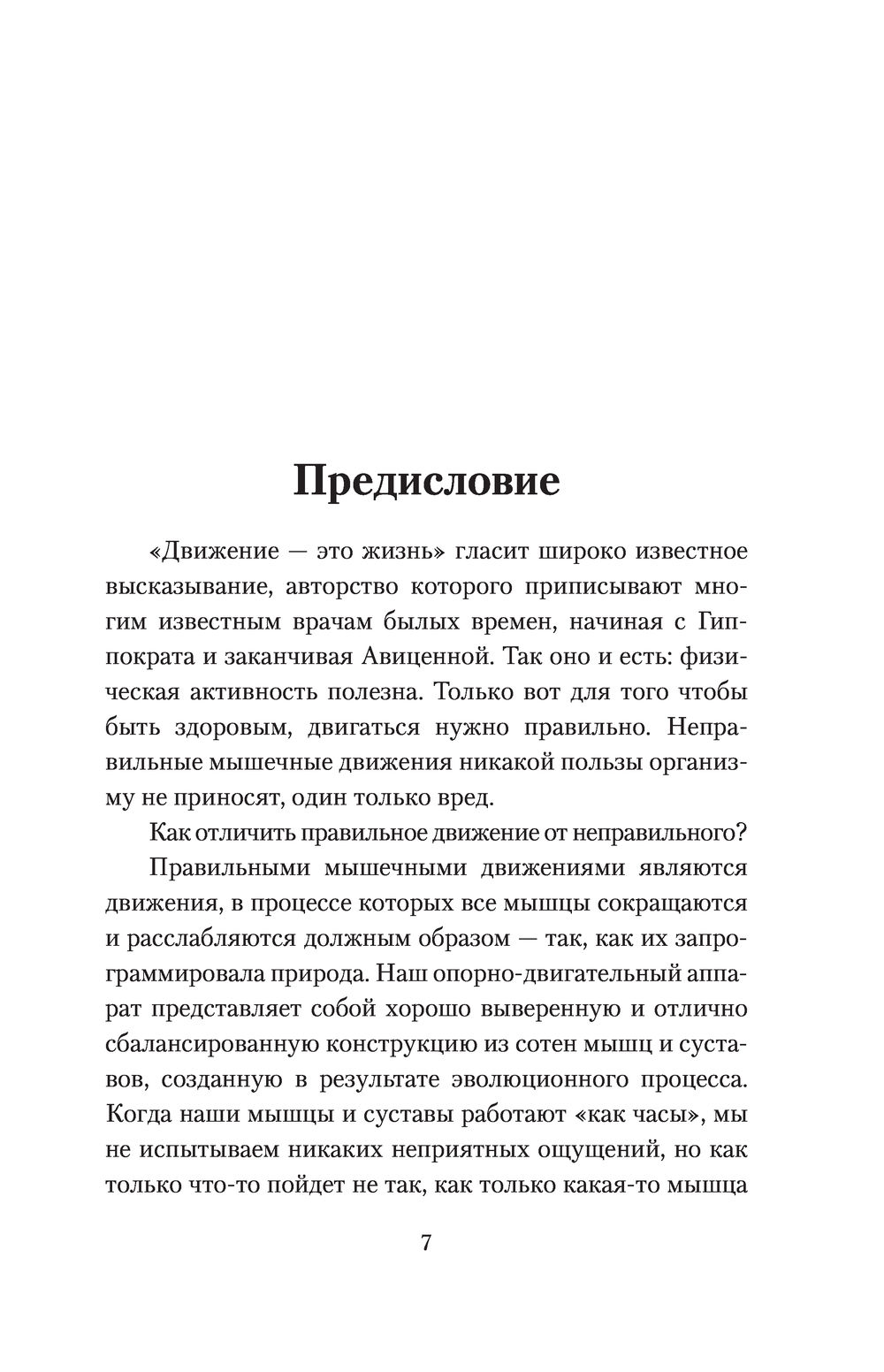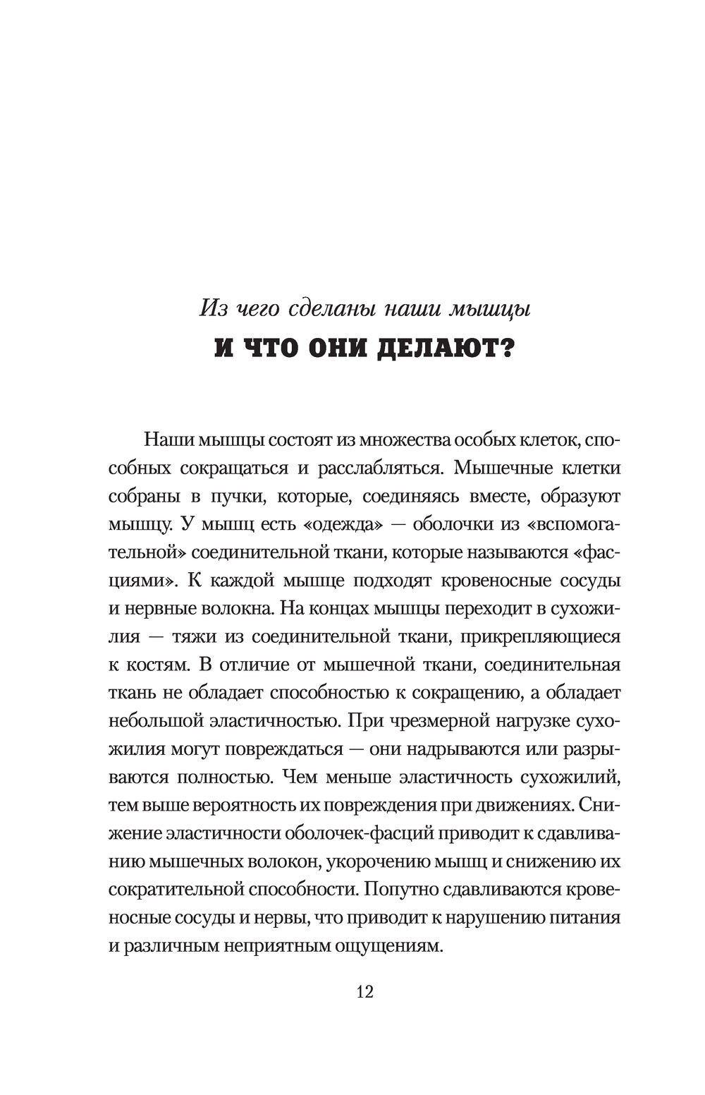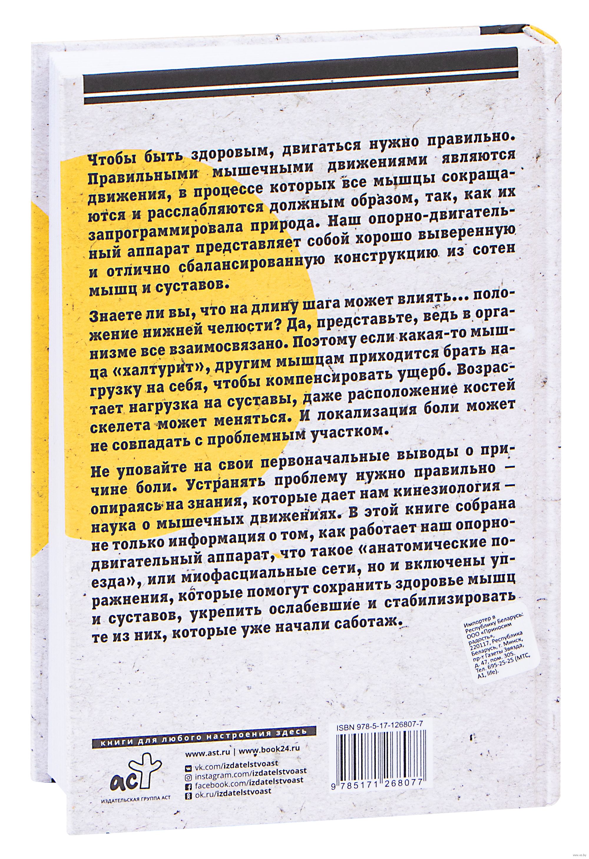 Чтобы быть здоровым, двигаться нужно правильно. Правильными мышечными движениями являются движения, в процессе которых все мышцы сокращаются и расслабляются должным образом – так, как их запрограммировала природа. Наш опорно-двигательный аппарат представляет собой хорошо выверенную и отлично сбалансированную конструкцию из сотен мышц и суставов. Знаете ли вы, что на длину шага может влиять... положение нижней челюсти? Да, представьте, ведь в организме все взаимосвязано. Поэтому если какая-то мышца "халтурит", другим мышцам приходится брать нагрузку на себя, чтобы компенсировать ущерб. Возрастает нагрузка на суставы, даже расположение костей скелета может меняться. И локализация боли может не совпадать с проблемным участком. Не уповайте на свои первоначальные выводы о причине боли. Устранять проблему нужно правильно – опираясь на знания, которые дает нам кинезиология – наука о мышечных движениях. В этой книге собрана не только информация о том, как работает наш опорно-двигательный аппарат, что такое "анатомические поезда", или миофасциальные сети, но и включены упражнения, которые помогут сохранить здоровье мышц и суставов, укрепить ослабевшие и стабилизировать те из них, которые уже начали саботаж.