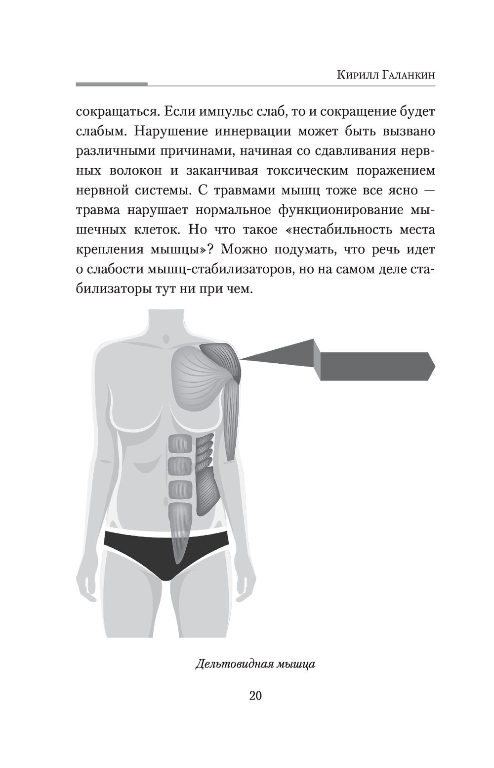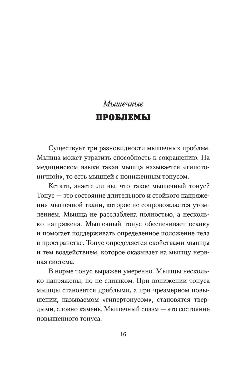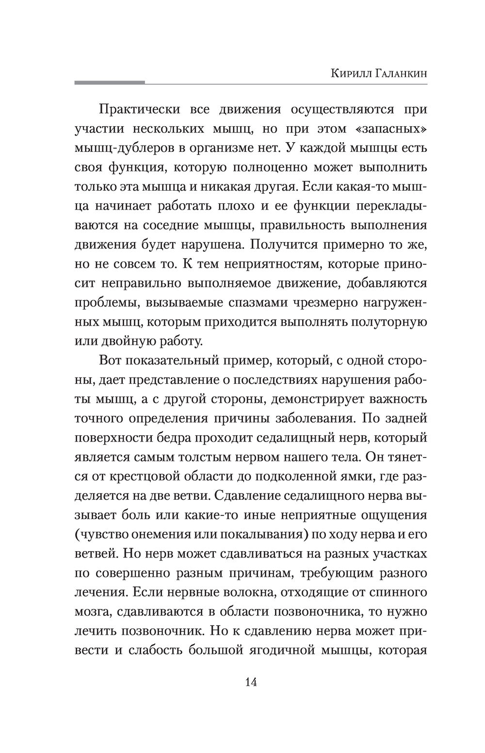 Чтобы быть здоровым, двигаться нужно правильно. Правильными мышечными движениями являются движения, в процессе которых все мышцы сокращаются и расслабляются должным образом – так, как их запрограммировала природа. Наш опорно-двигательный аппарат представляет собой хорошо выверенную и отлично сбалансированную конструкцию из сотен мышц и суставов. Знаете ли вы, что на длину шага может влиять... положение нижней челюсти? Да, представьте, ведь в организме все взаимосвязано. Поэтому если какая-то мышца "халтурит", другим мышцам приходится брать нагрузку на себя, чтобы компенсировать ущерб. Возрастает нагрузка на суставы, даже расположение костей скелета может меняться. И локализация боли может не совпадать с проблемным участком. Не уповайте на свои первоначальные выводы о причине боли. Устранять проблему нужно правильно – опираясь на знания, которые дает нам кинезиология – наука о мышечных движениях. В этой книге собрана не только информация о том, как работает наш опорно-двигательный аппарат, что такое "анатомические поезда", или миофасциальные сети, но и включены упражнения, которые помогут сохранить здоровье мышц и суставов, укрепить ослабевшие и стабилизировать те из них, которые уже начали саботаж.