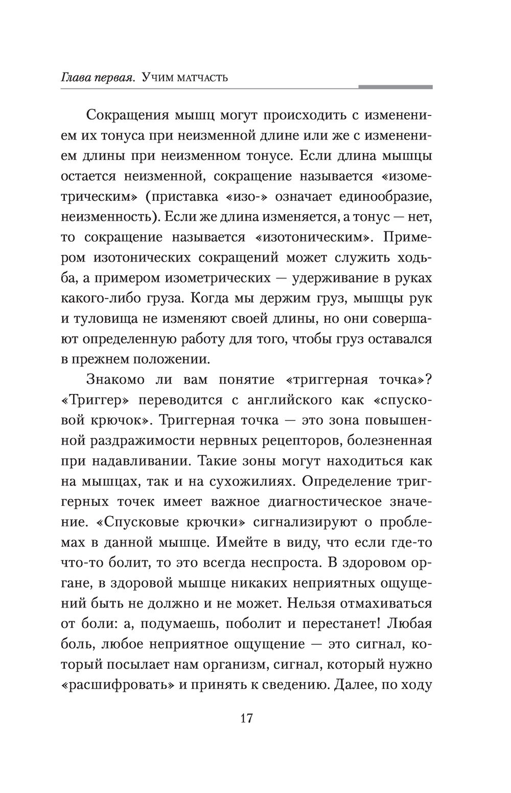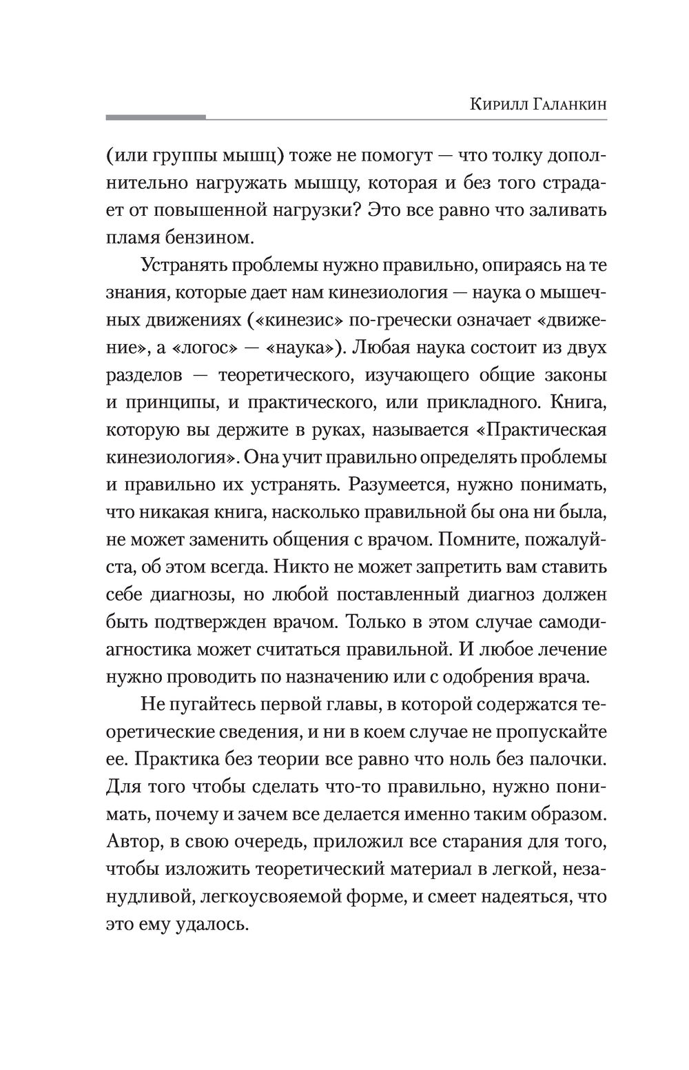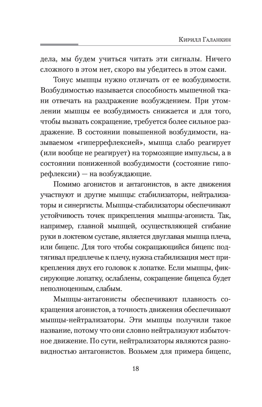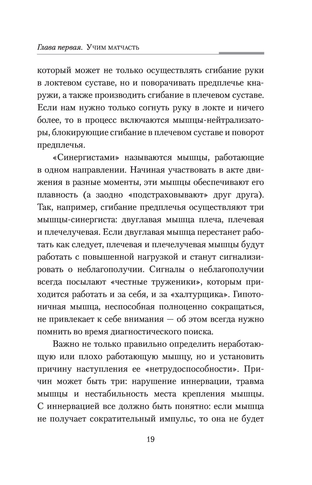 Чтобы быть здоровым, двигаться нужно правильно. Правильными мышечными движениями являются движения, в процессе которых все мышцы сокращаются и расслабляются должным образом – так, как их запрограммировала природа. Наш опорно-двигательный аппарат представляет собой хорошо выверенную и отлично сбалансированную конструкцию из сотен мышц и суставов. Знаете ли вы, что на длину шага может влиять... положение нижней челюсти? Да, представьте, ведь в организме все взаимосвязано. Поэтому если какая-то мышца "халтурит", другим мышцам приходится брать нагрузку на себя, чтобы компенсировать ущерб. Возрастает нагрузка на суставы, даже расположение костей скелета может меняться. И локализация боли может не совпадать с проблемным участком. Не уповайте на свои первоначальные выводы о причине боли. Устранять проблему нужно правильно – опираясь на знания, которые дает нам кинезиология – наука о мышечных движениях. В этой книге собрана не только информация о том, как работает наш опорно-двигательный аппарат, что такое "анатомические поезда", или миофасциальные сети, но и включены упражнения, которые помогут сохранить здоровье мышц и суставов, укрепить ослабевшие и стабилизировать те из них, которые уже начали саботаж.
