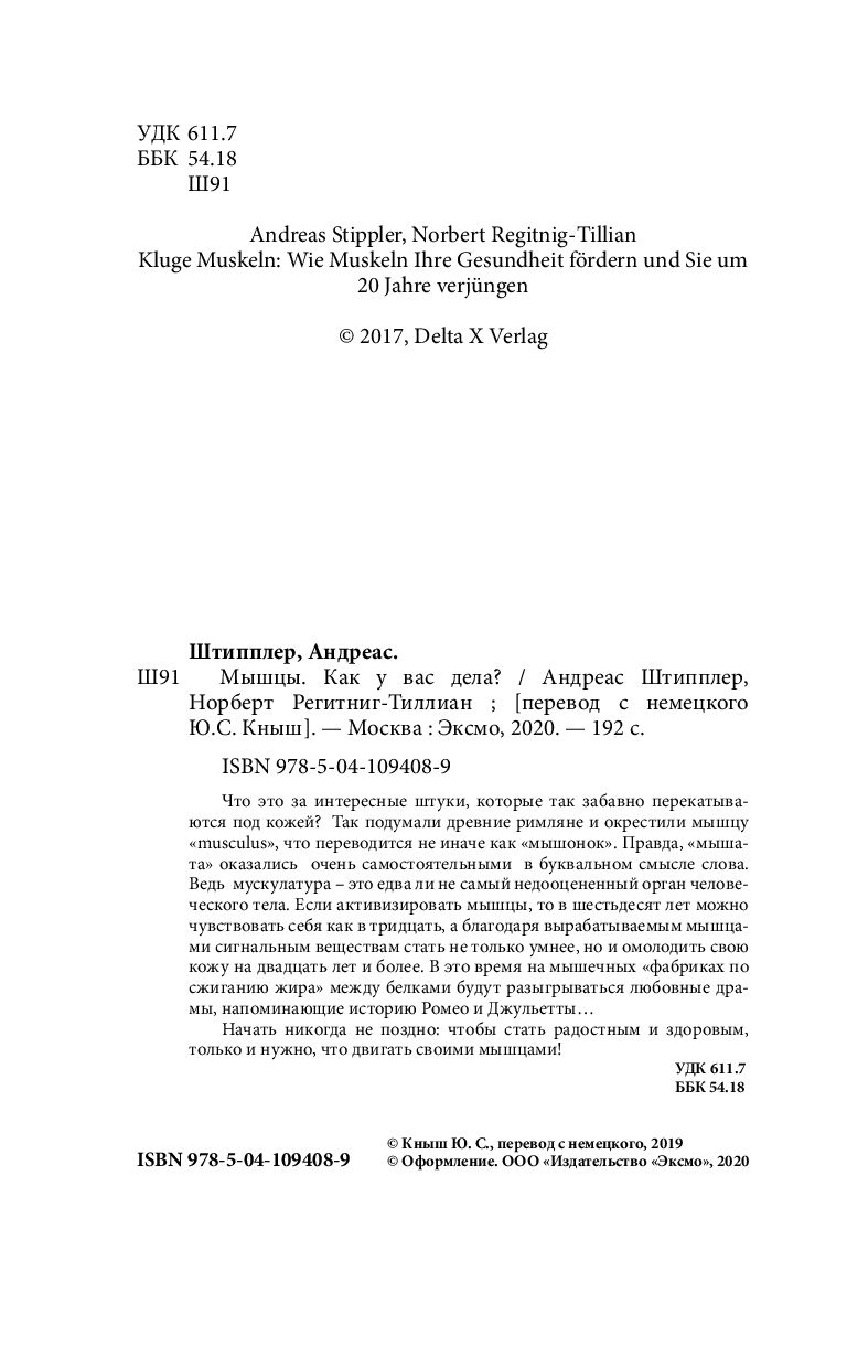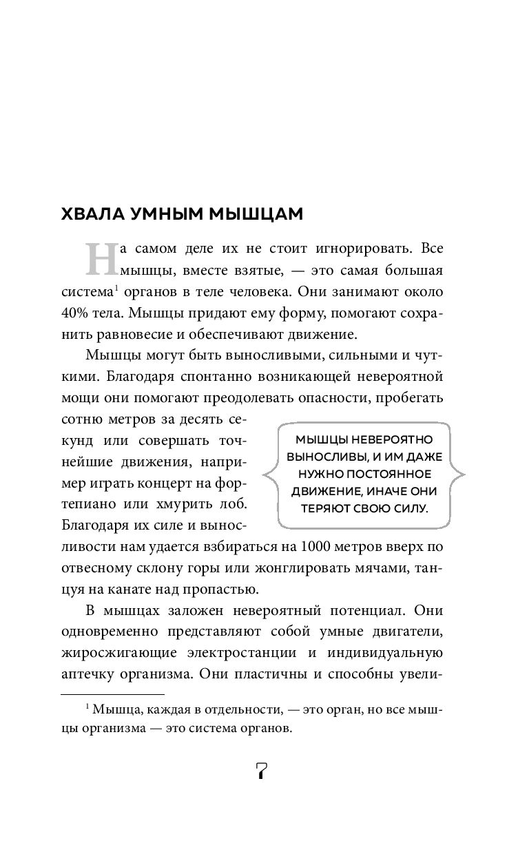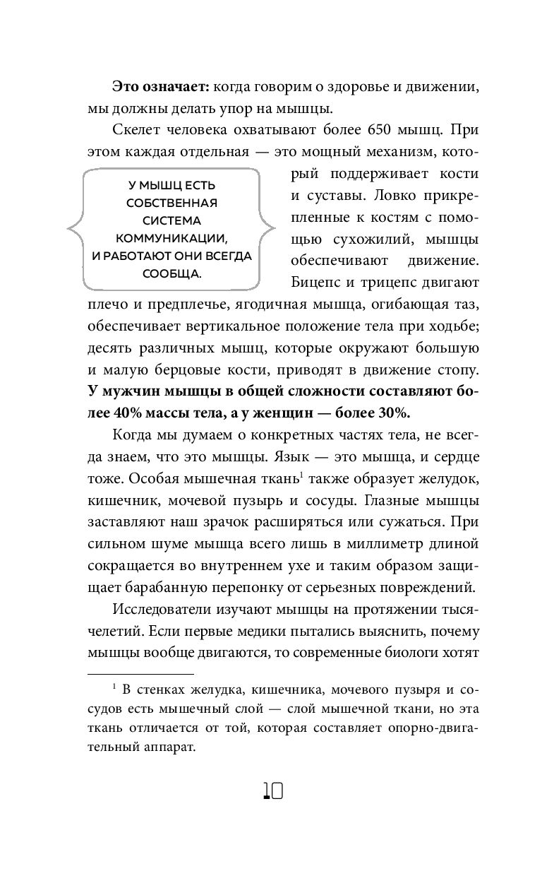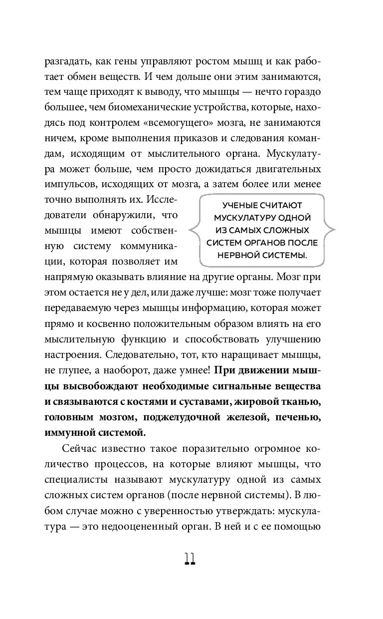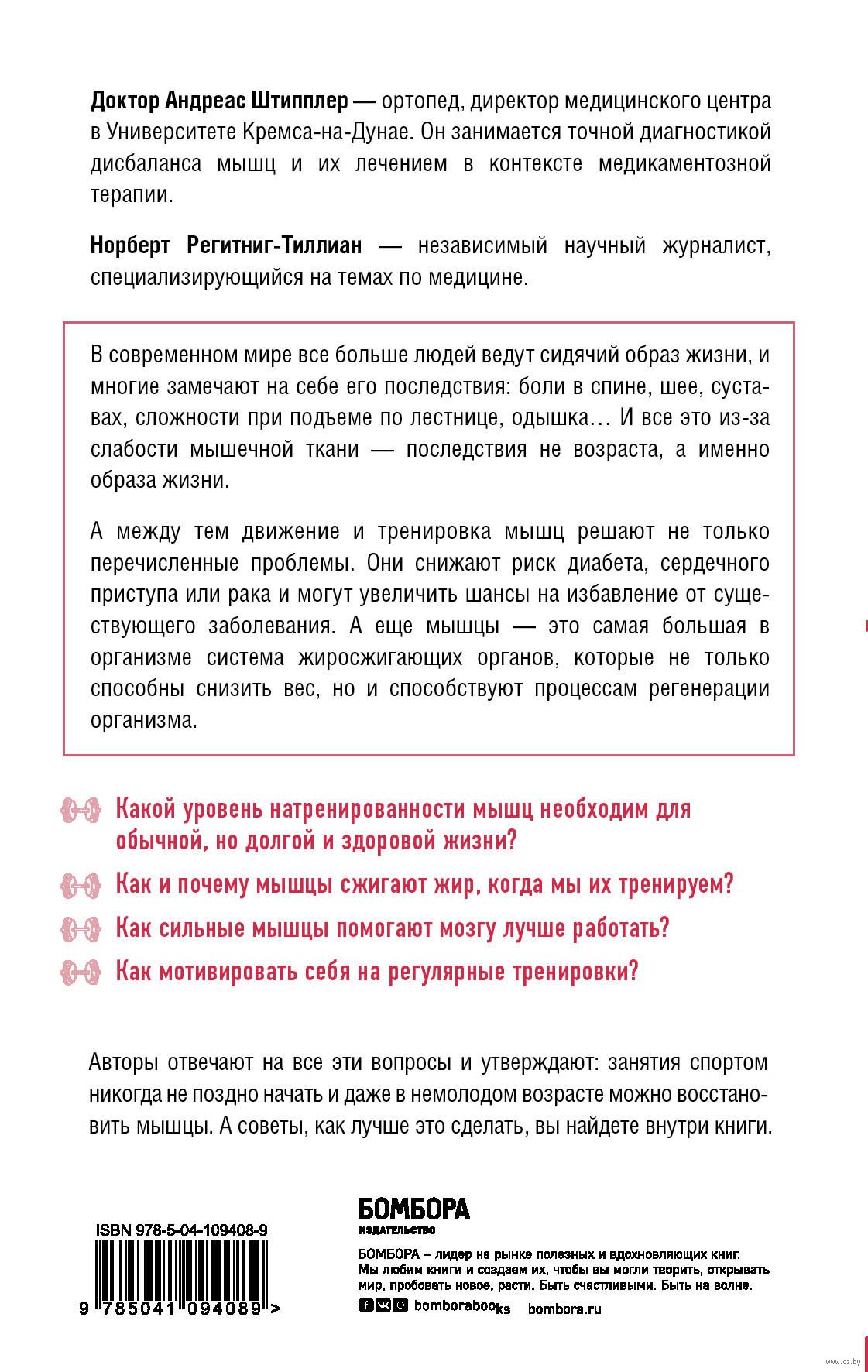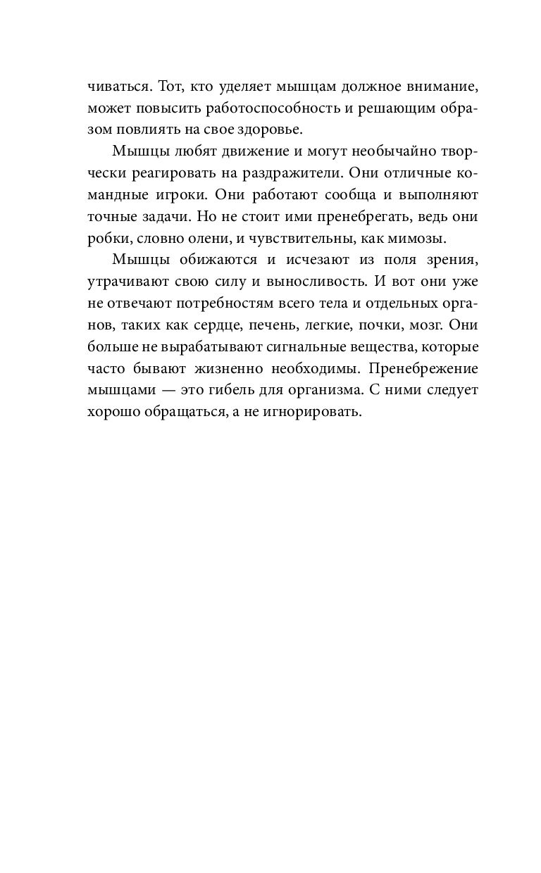Что это за интересные штуки, которые так забавно перекатываются под кожей? Так подумали древние римляне и окрестили мышцу "musculus", что переводится не иначе как "мышонок". Правда, "мышата" оказались очень самостоятельными в буквальном смысле слова. Ведь мускулатура – это едва ли не самый недооцененный орган человеческого тела. Если активизировать мышцы, то в шестьдесят лет можно чувствовать себя как в тридцать, а благодаря вырабатываемым мышцами сигнальным веществам стать не только умнее, но и омолодить свою кожу на двадцать лет и более. В это время на мышечных "фабриках по сжиганию жира" между белками будут разыгрываться любовные драмы, напоминающие историю Ромео и Джульетты...