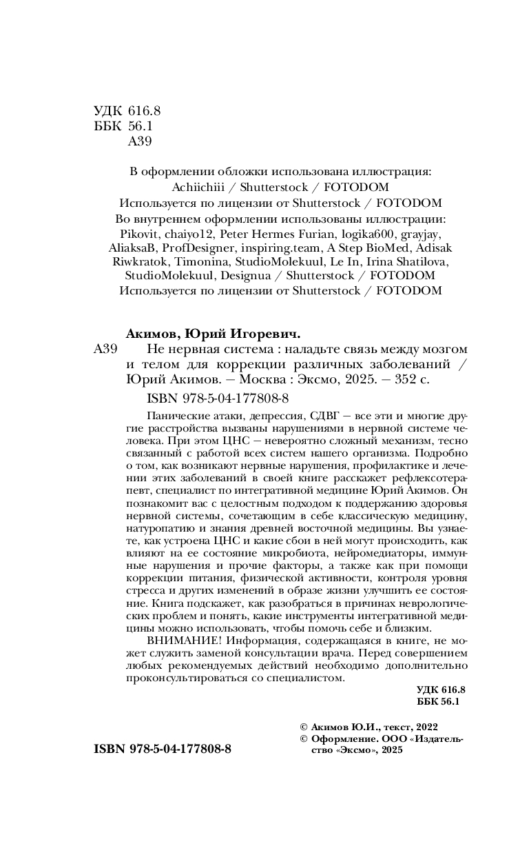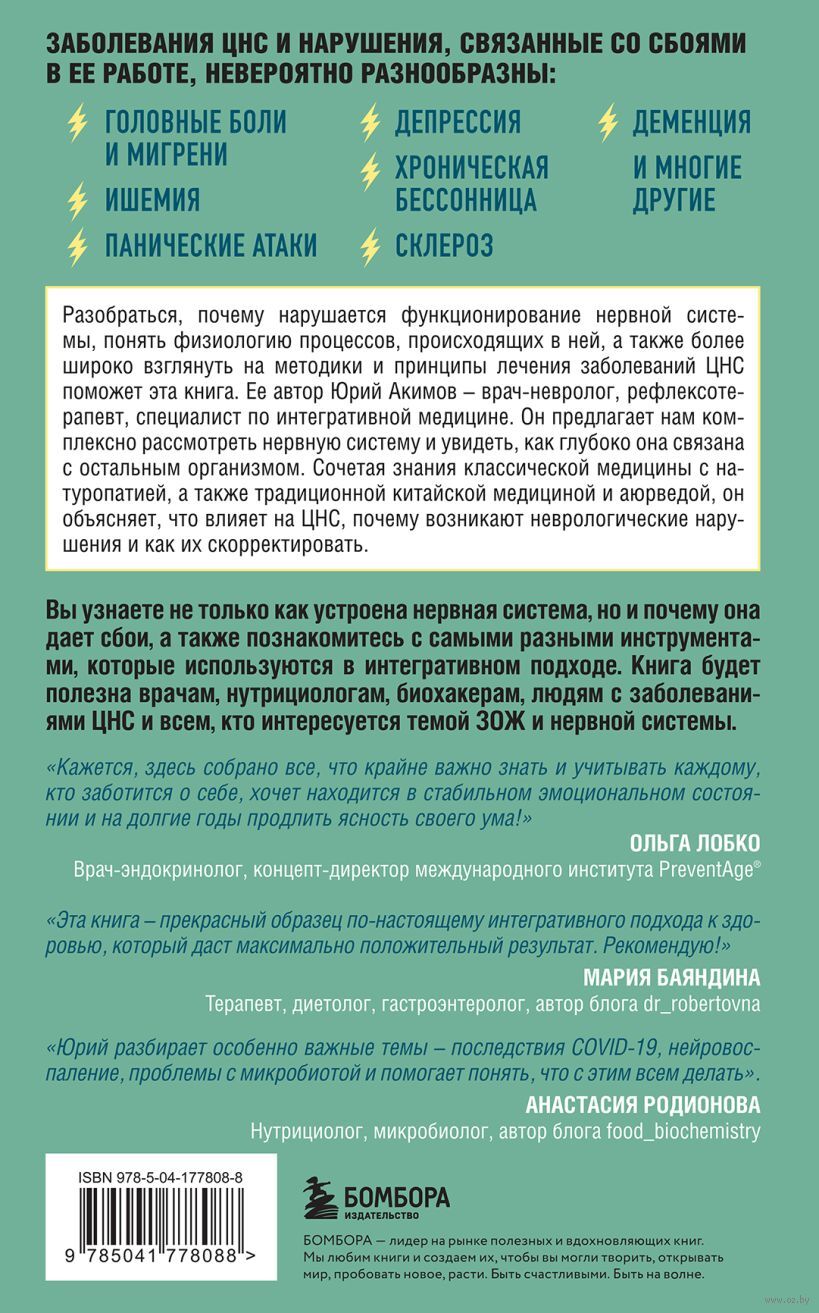 Панические атаки, депрессия, СДВГ – все эти и многие другие расстройства вызваны нарушениями в нервной системе человека. При это всем ЦНС – невероятно сложный механизм, тесно связанный с работой все систем нашего организма. Подробно о том, как возникают эти заболевания, профилактике и лечении в своей книге расскажет рефлексотерапевт, специалист по интегративной медицине – Юрий Акимов. Он познакомит вас с целостным подходом к поддержанию здоровья нервной системы, сочетающим в себе классическую медицину, натуропатию и знания древней восточной медицины. Вы узнаете, как устроена ЦНС и какие сбои в ней могут происходить, как влияют на ее состояние микробиота, нейромедиаторы, иммунные нарушения и прочие факторы, а также как при помощи коррекции питания, физической активности, контроля уровня стресса и других изменений в образе жизни улучшить ее состояние. Книга подскажет, как разобраться в причинах неврологических проблем и понять, какие инструменты интегративной медицины можно использовать, чтобы помочь себе и близким.