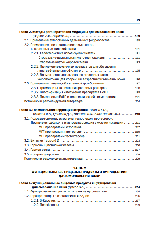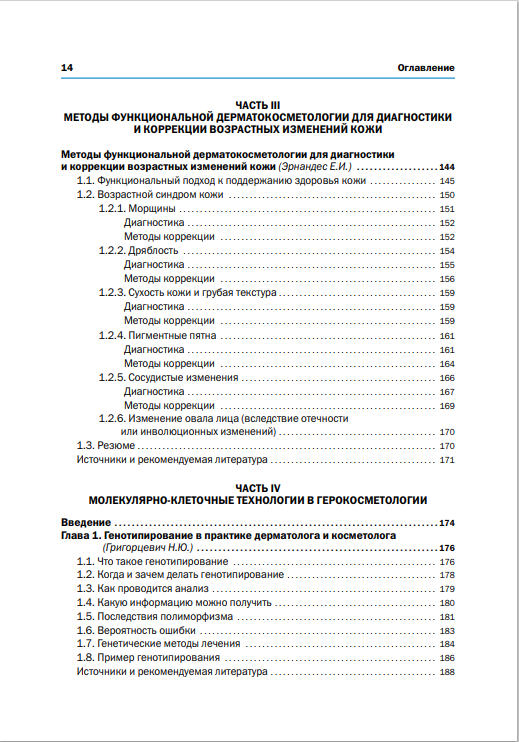 Чтобы специалист мог понимать, что он делает, и подбирать индивидуальные программы коррекции, книга начинается с подробного описания физиологии старения кожи. Мы кратко, но емко освещаем современные представления о процессе старения кожи — от молекулярно-клеточных механизмов до объективной оценки признаков старения с помощью инструментальных методов анализа состояния кожи, имеющихся в распоряжении косметолога. Уже сегодня косметолог может внедрить в свою практику такой диагностический метод персонализированной медицины, как генетический тест, чтобы оценить индивидуальную реакцию пациента на дермальный имплантат или то или иное аппаратное воздействие.