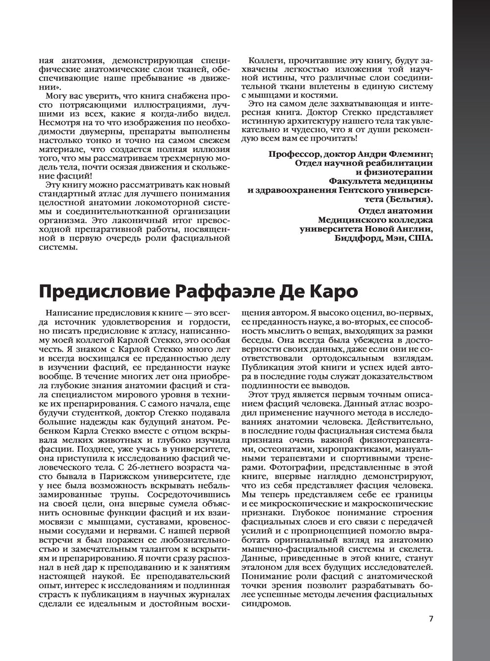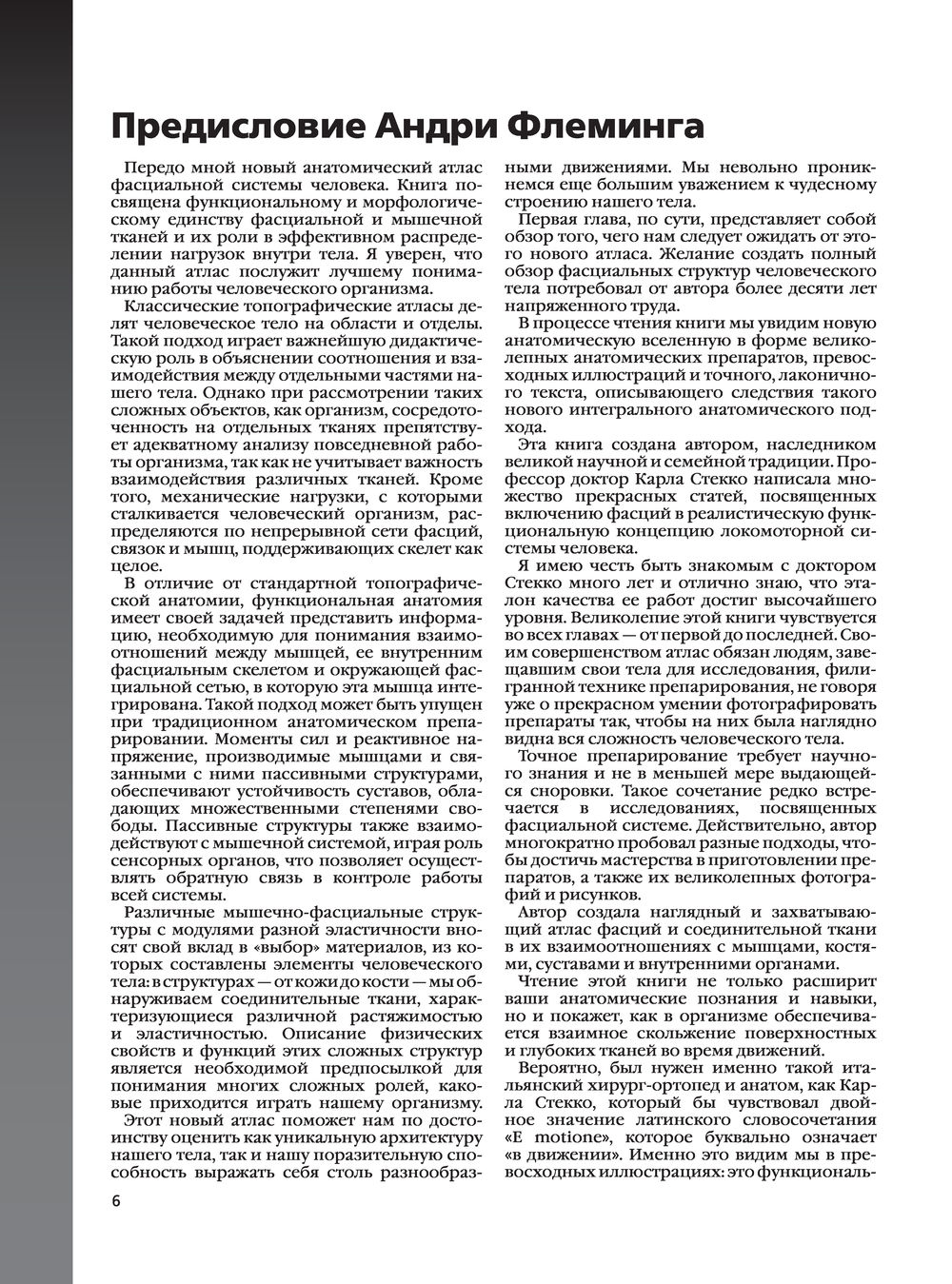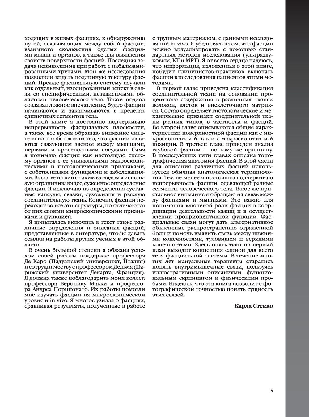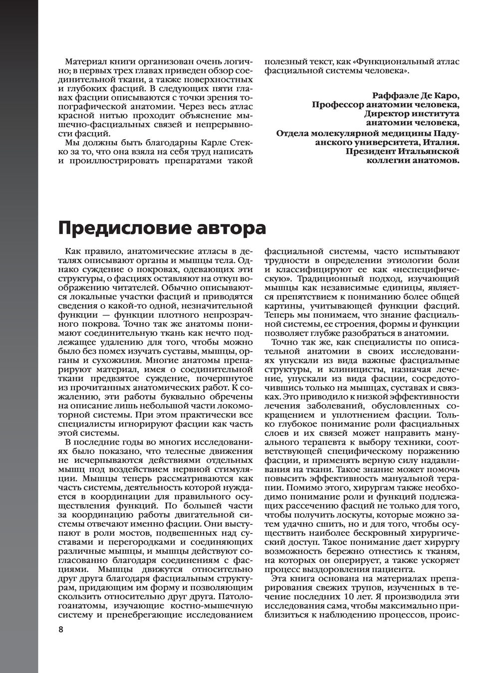 Карла Стекко – хирург-ортопед и профессор анатомии и спортивной деятельности – объединяет исследования многопрофильной группы исследователей и клиницистов. В этом атласе впервые представлен глобальный взгляд на фасции и фактические связи, которые описывают миофасциальные кинетические цепи. Эти описания помогают объяснить, какую роль играет фасция в миофасциальной дисфункции и заболевании, а также как она может изменять функцию мышц и нарушать проприоцептивную активность. Профессор Стекко также подчеркивает непрерывность фасциальных плоскостей, объясняя функцию фасций и их связь между мышцами, нервами и кровеносными сосудами, что поможет практикующему врачу выбрать правильную технику для решения конкретной проблемы. В первой главе приводится классификация соединительной ткани и объясняется ее состав с точки зрения процентного содержания волокон, клеток и внеклеточного матрикса. Во второй главе описываются общие характеристики поверхностной фасции с макроскопической и микроскопической точек зрения; в третьей таким же образом анализируется глубокая фасция. Следующие пять глав описывают фасции с топографической точки зрения.