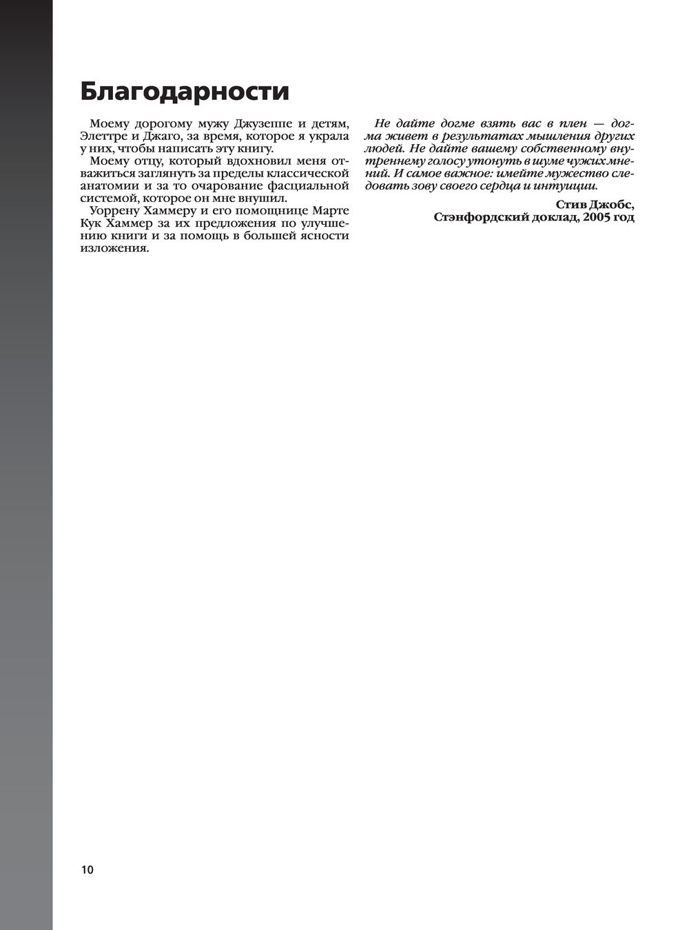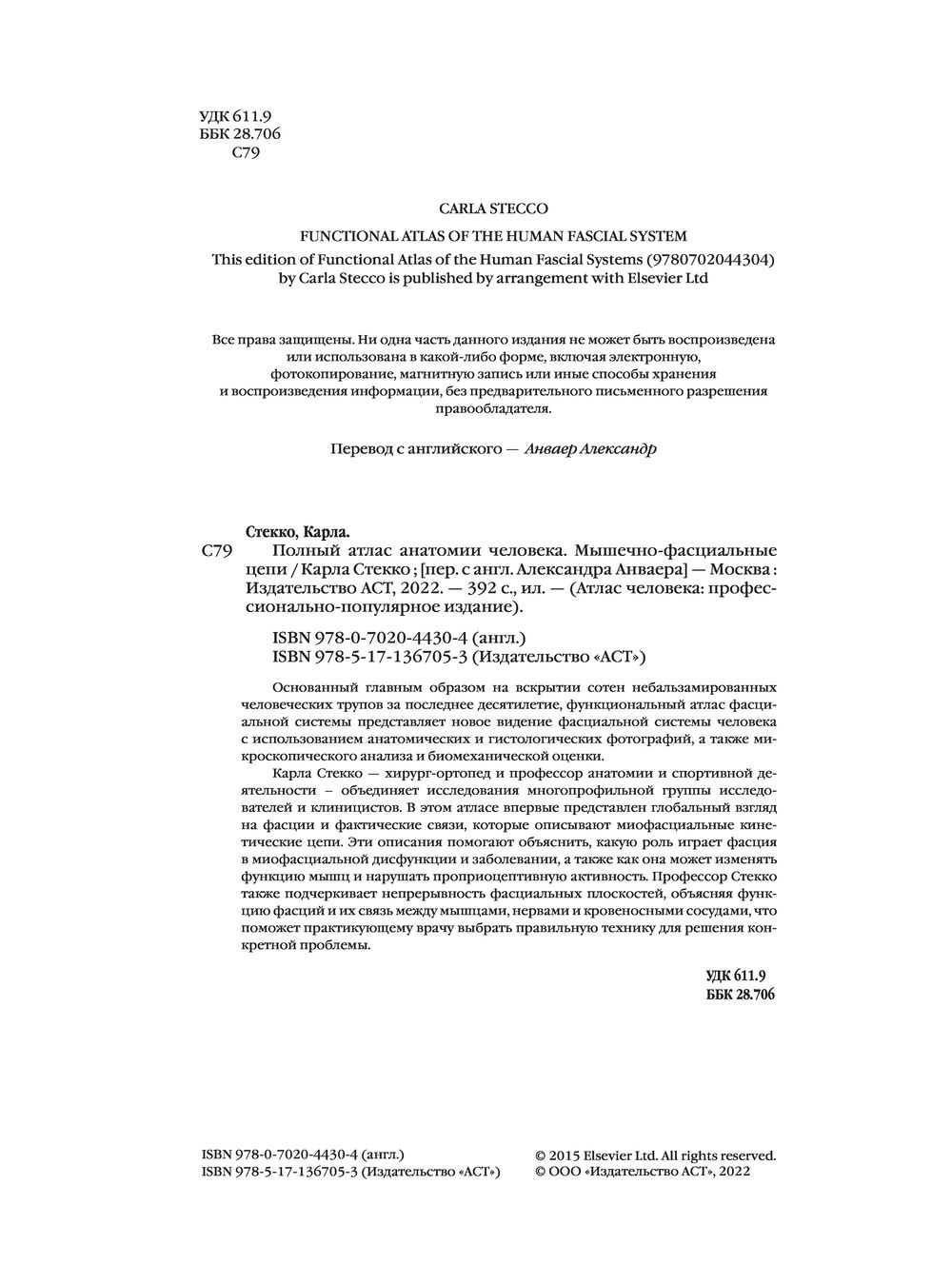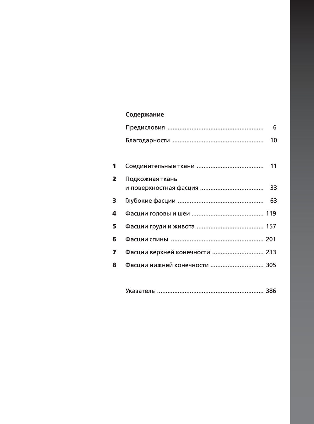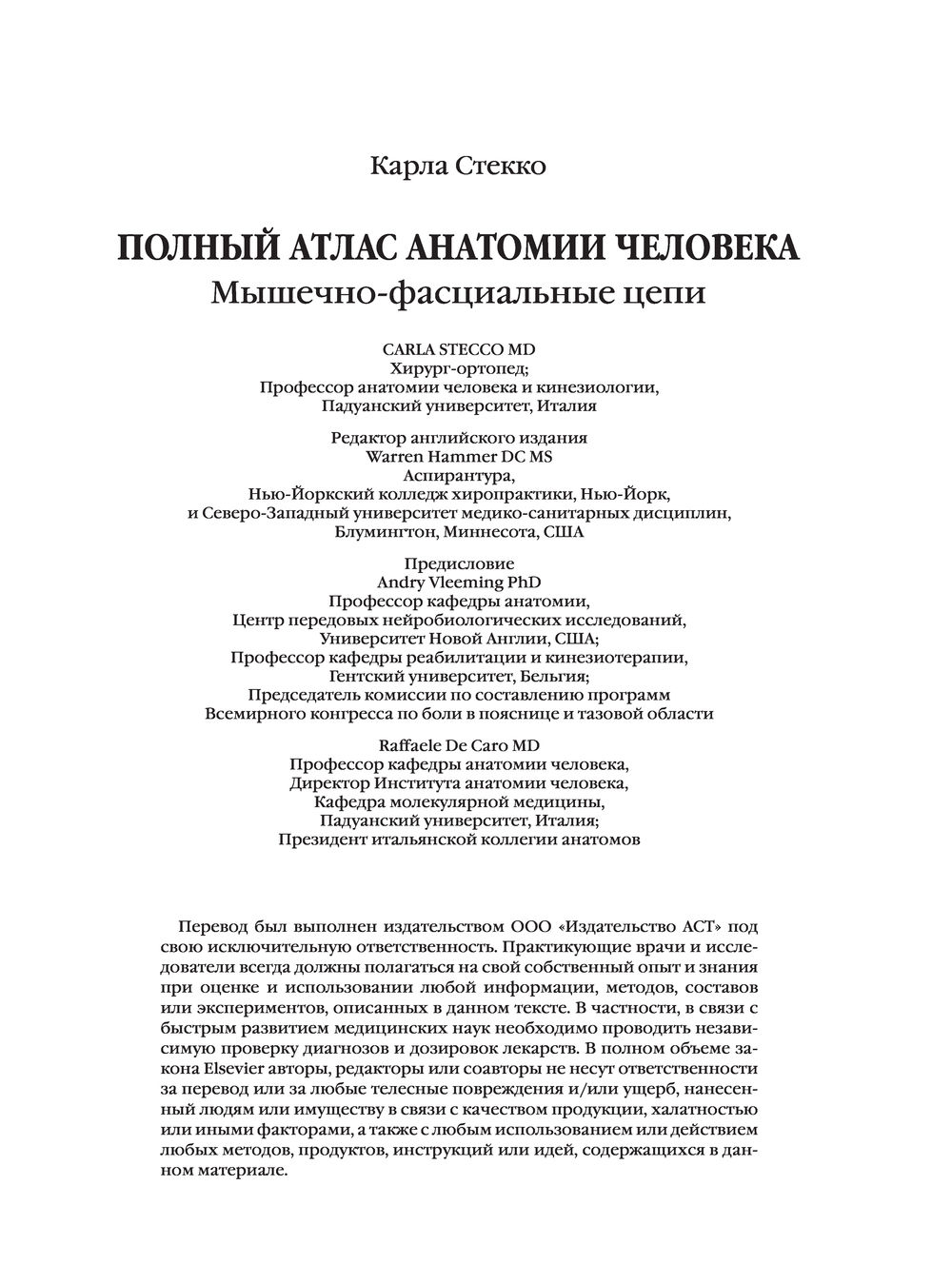 Карла Стекко – хирург-ортопед и профессор анатомии и спортивной деятельности – объединяет исследования многопрофильной группы исследователей и клиницистов. В этом атласе впервые представлен глобальный взгляд на фасции и фактические связи, которые описывают миофасциальные кинетические цепи. Эти описания помогают объяснить, какую роль играет фасция в миофасциальной дисфункции и заболевании, а также как она может изменять функцию мышц и нарушать проприоцептивную активность. Профессор Стекко также подчеркивает непрерывность фасциальных плоскостей, объясняя функцию фасций и их связь между мышцами, нервами и кровеносными сосудами, что поможет практикующему врачу выбрать правильную технику для решения конкретной проблемы. В первой главе приводится классификация соединительной ткани и объясняется ее состав с точки зрения процентного содержания волокон, клеток и внеклеточного матрикса. Во второй главе описываются общие характеристики поверхностной фасции с макроскопической и микроскопической точек зрения; в третьей таким же образом анализируется глубокая фасция. Следующие пять глав описывают фасции с топографической точки зрения.