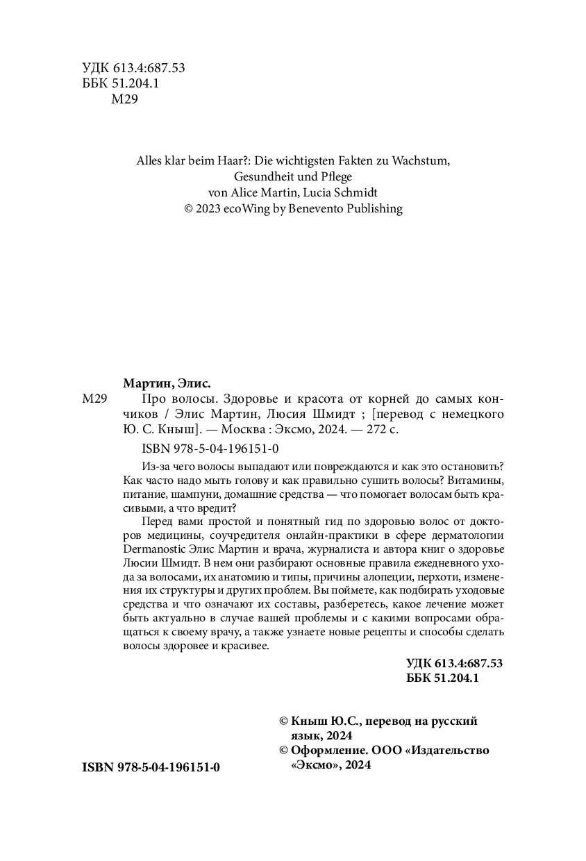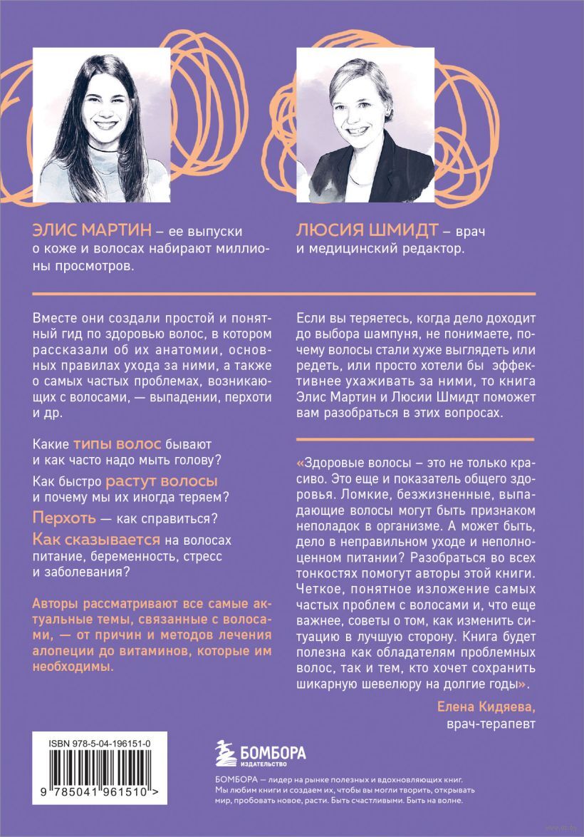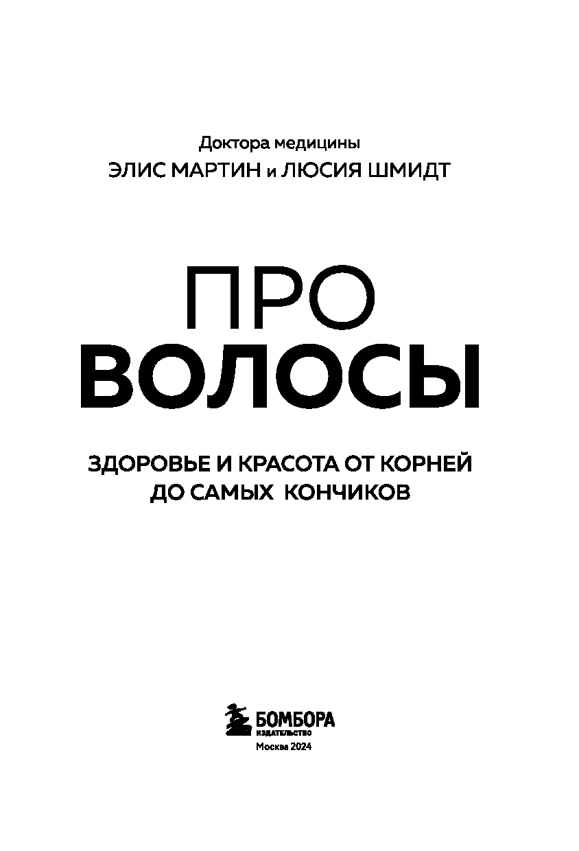 Перед вами простой и понятный гид по здоровью волос от докторов медицины, соучредителя онлайн-практики в сфере дерматологии Dermanostic Элис Мартин и врача, журналиста и автора книг о здоровье Люсии Шмидт. В нем они разбирают основные правила ежедневного ухода за волосами, их анатомию и типы, причины алопеции, перхоти, изменения их структуры и других проблем. Вы поймете, как подбирать уходовые средства и что означают их составы, разберетесь, какое лечение может быть актуально в случае вашей проблемы и с какими вопросами обращаться к своему врачу, а также узнаете новые рецепты и способы сделать волосы здоровее и красивее.