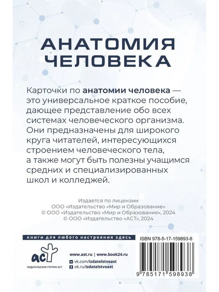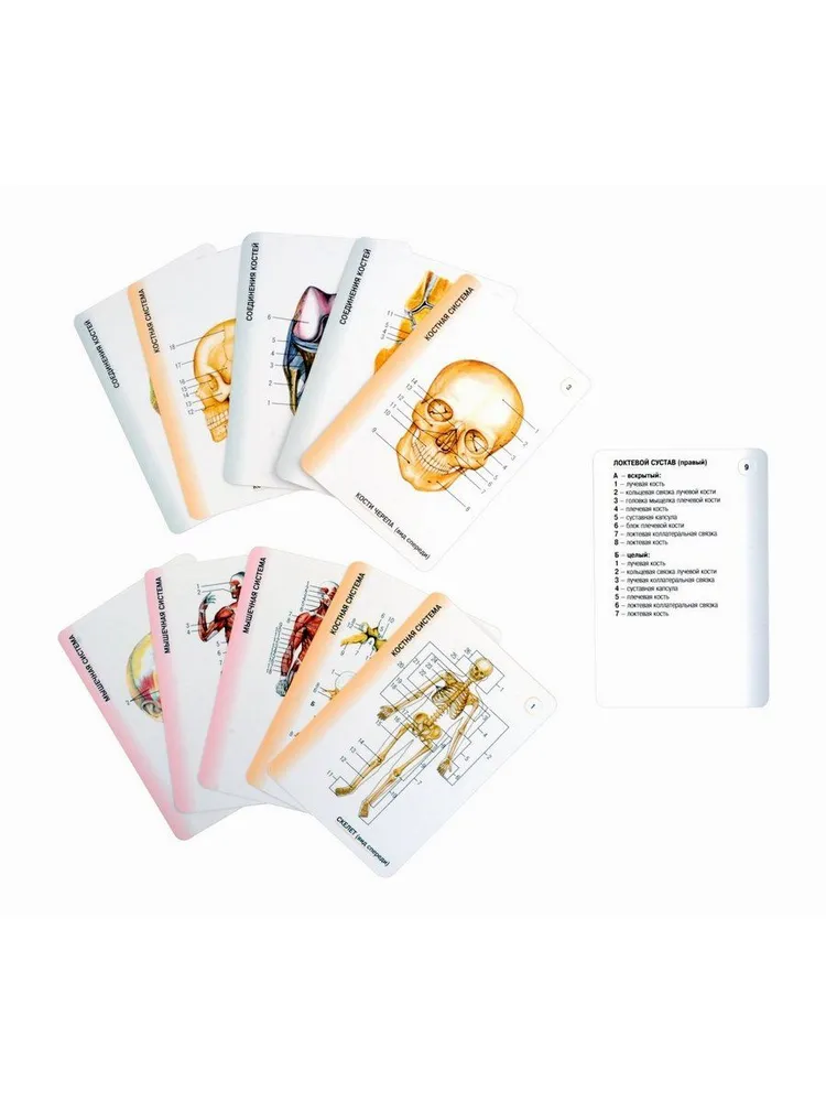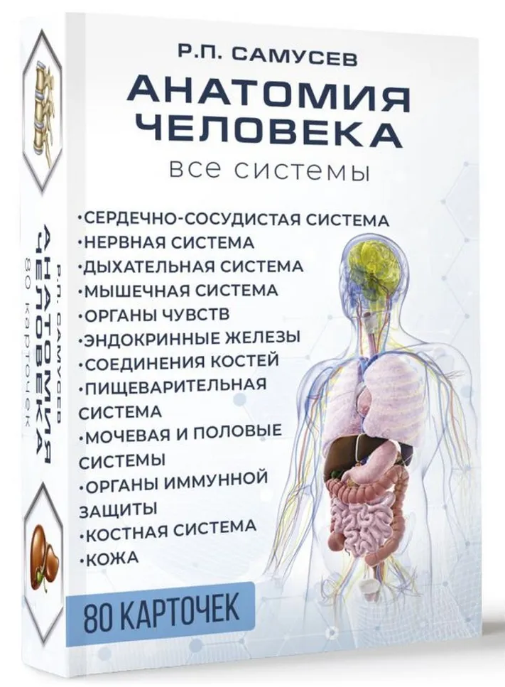 Карточки по анатомии человека - это универсальное краткое пособие, дающее представление обо всех системах человеческого организма. Цветные рисунки с подробными указателями и названиями. От автора классических учебников по анатомии и физиологии Р.П. Самусева. Они предназначены для широкого круга читателей, интересующихся строением человеческого тела, а также могут быть полезны учащимся средних и специализированных школ и колледжей. Все Системы: Сердечно-сосудистая система. Нервная система. Дыхательная система. Мышечная система. Органы чувств. Эндокринные железы. Соединения костей. Пищеварительная система. Мочевая и половые системы. Органы иммунной защиты. Костная система. Кожа.