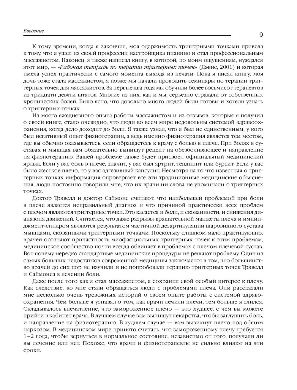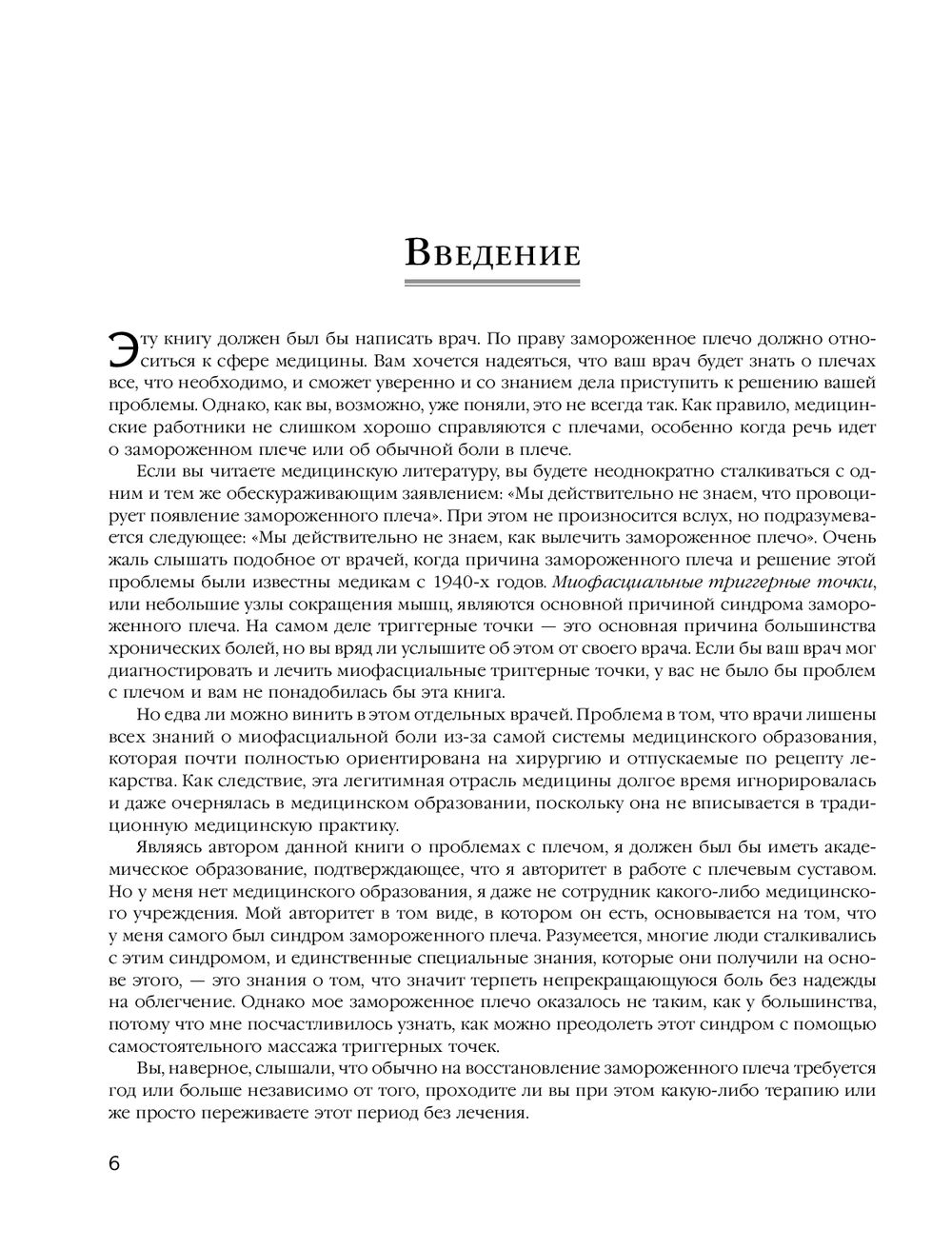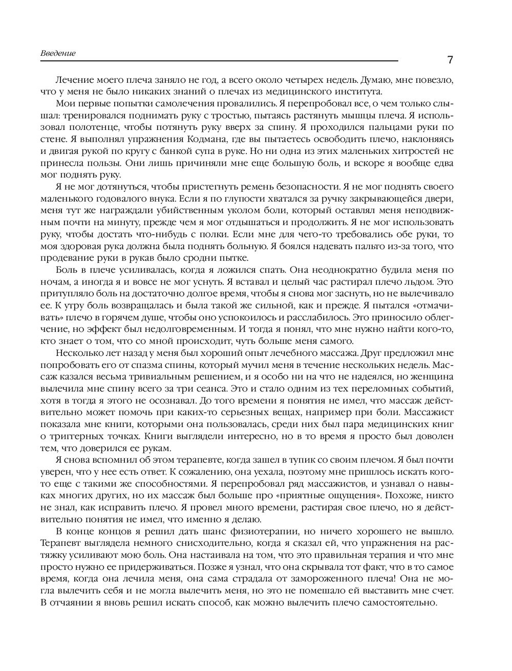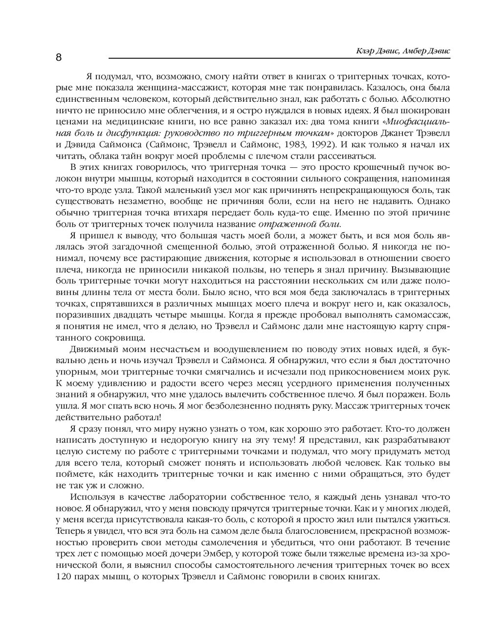 Триггерная точка – это просто крошечный пучок волокон внутри мышцы, который находится в состоянии сильного сокращения, напоминая что-то вроде "узла". Такой маленький узел может как причинять непрекращающуюся боль, так и существовать незаметно, вообще не причиняя боли, если на него не надавить. Однако обычно триггерная точка незаметно передает боль куда-то еще. Эта книга посвящена терапии триггерных точек, ответственных за развитие различных болевых синдромов в области шеи и плеч. Массажи и самомассажи, а также методики поиска истинных источников боли, делают издание незаменимым как для специалистов движения, так и для обычных людей.