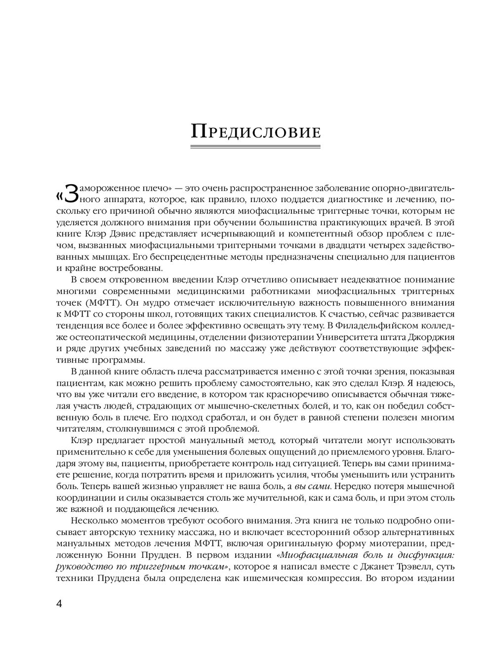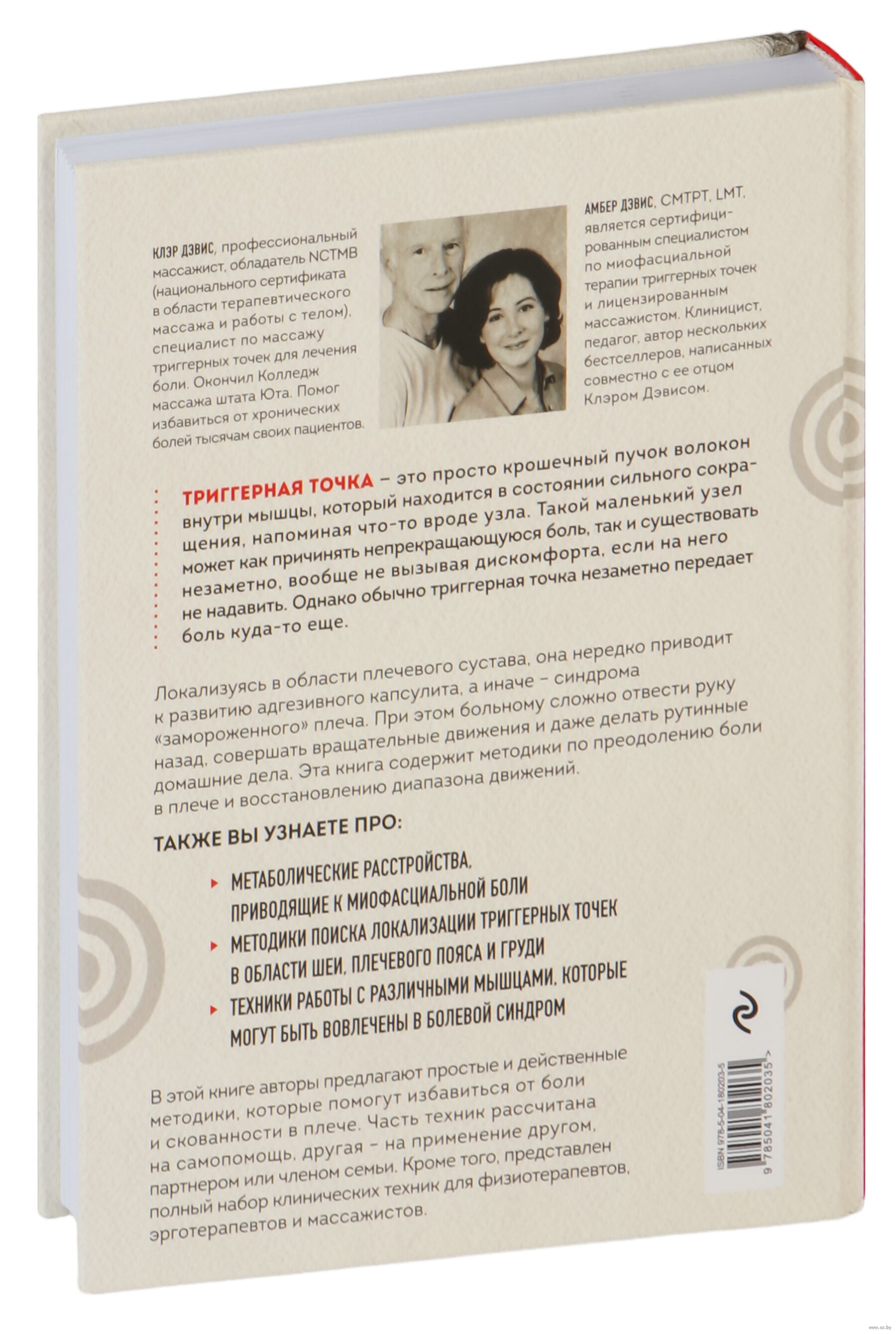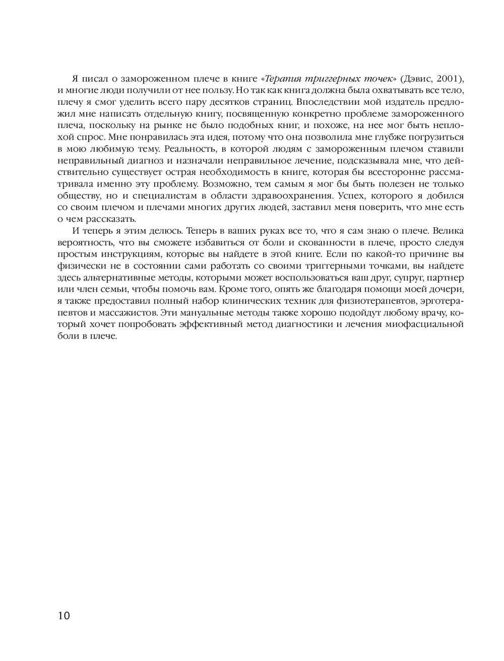Триггерная точка – это просто крошечный пучок волокон внутри мышцы, который находится в состоянии сильного сокращения, напоминая что-то вроде "узла". Такой маленький узел может как причинять непрекращающуюся боль, так и существовать незаметно, вообще не причиняя боли, если на него не надавить. Однако обычно триггерная точка незаметно передает боль куда-то еще. Эта книга посвящена терапии триггерных точек, ответственных за развитие различных болевых синдромов в области шеи и плеч. Массажи и самомассажи, а также методики поиска истинных источников боли, делают издание незаменимым как для специалистов движения, так и для обычных людей.