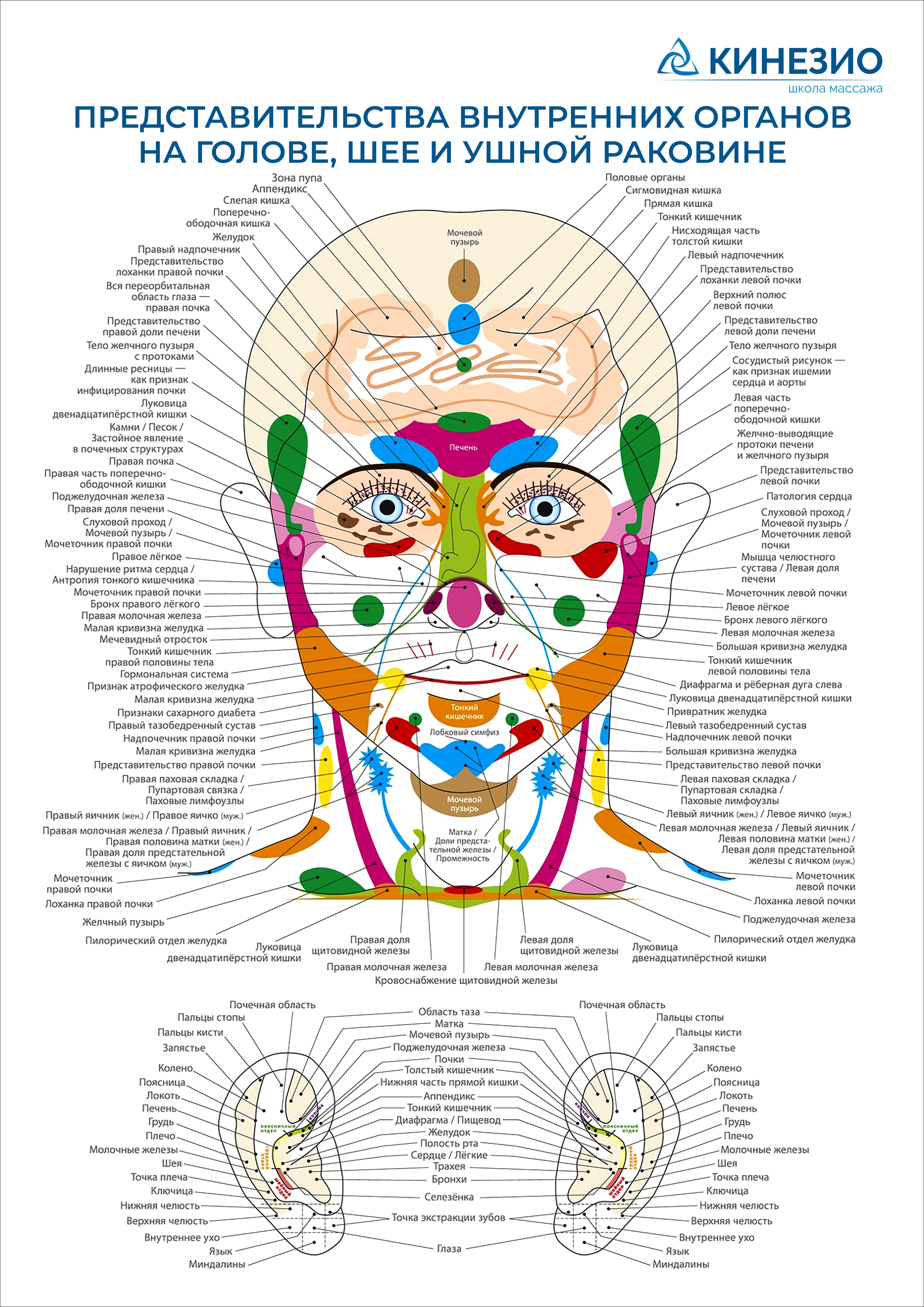 На плакате очень подробная информация о более чем 100 представительствах внутренних органов на голове, шее и ушной раковине. Изучение ее поможет при визуальной диагностике как профессиональным массажистам, медицинским работникам, так и рядовому обывателю.