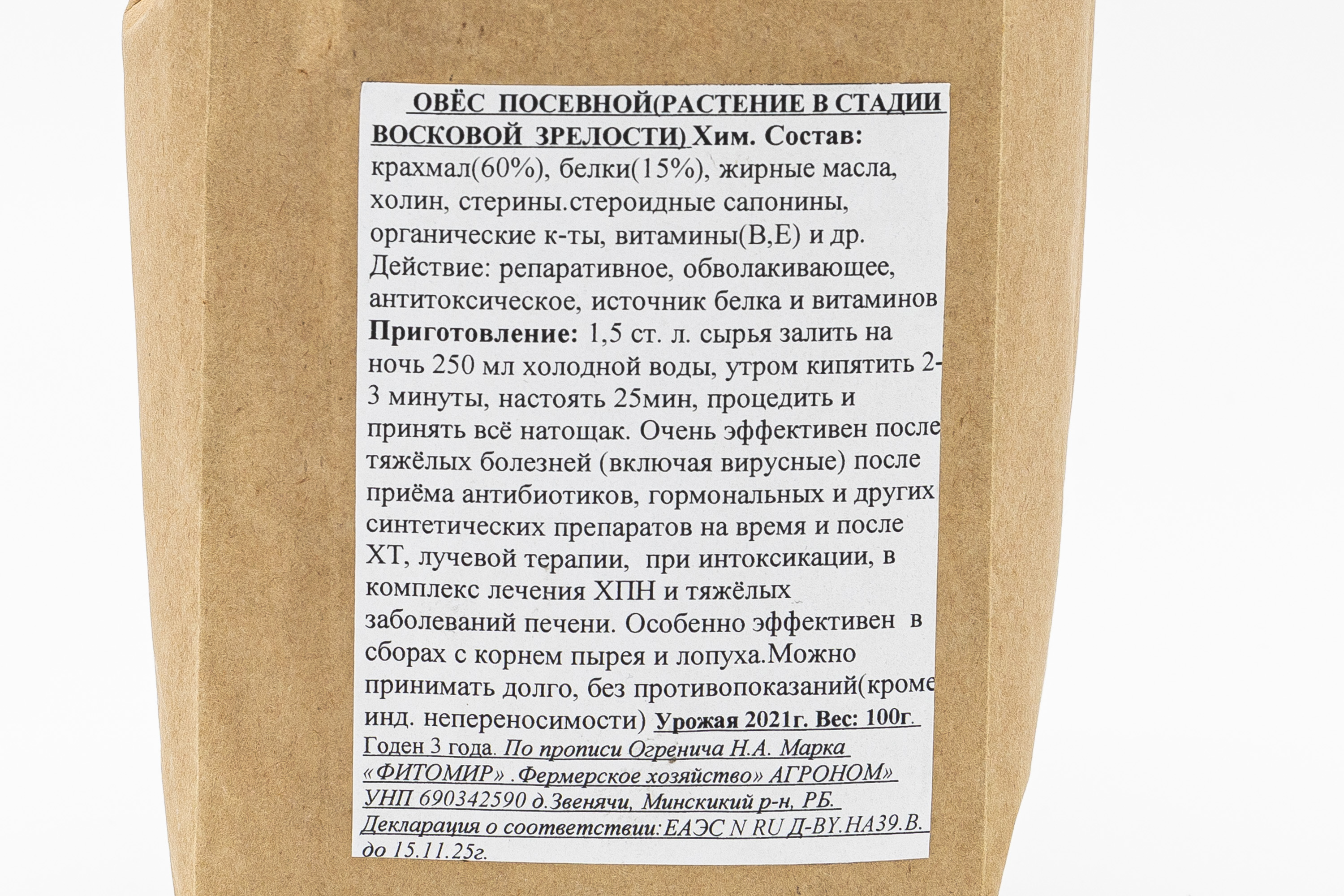 Состав: овёс посевной (растение в стадии восковой зрелости): крахмал (60%), белки (15%), жирные масла, холин, стерины, стероидные сапонины, витамины В,Е.