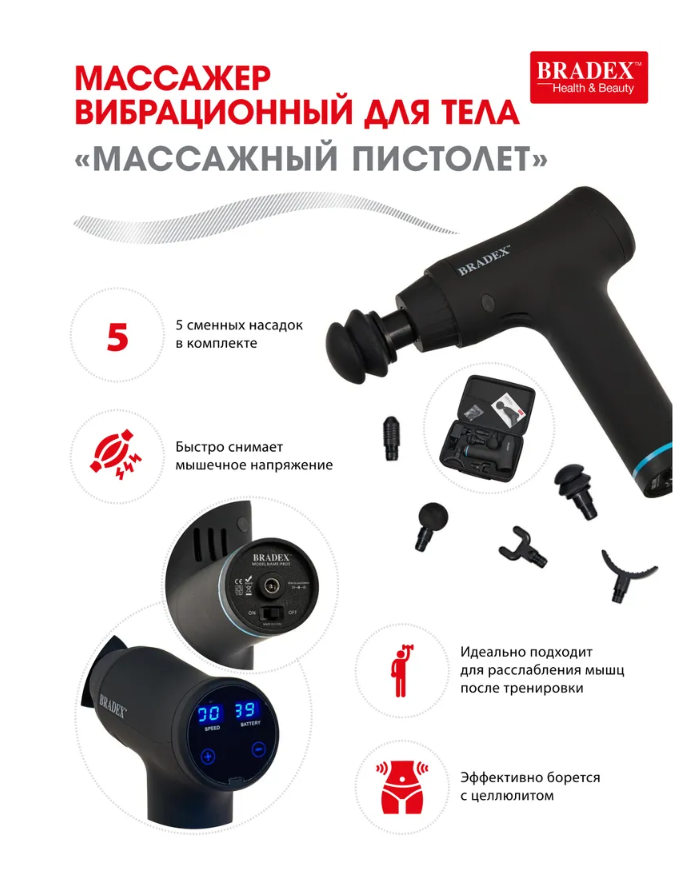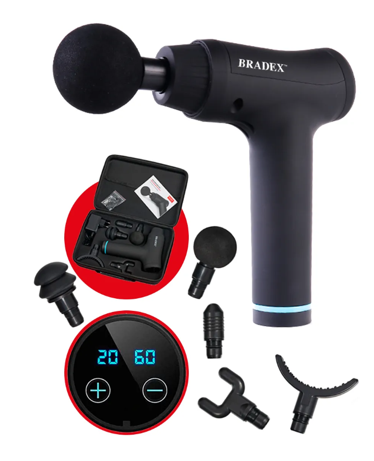 Массажный пистолет BRADEX работает по методу вибрационной терапии, которая позволяет облегчить мышечную боль, расслабить все тело и сократить время восстановления мышц после нагрузки. Разработан также для снятия усталости, массажа триггерных точек, улучшения циркуляции крови и работы опорно-двигательного аппарата.Может быть рекомендован спортсменам или людям, ведущим малоподвижный образ жизни, а также подверженным тяжелым физическим нагрузкам. Удобен в использовании: благодаря форме пистолета и противоскользящему покрытию удобно сидит в руке. Оснащен сменными насадками для разных групп мышц: спины, ног, рук, ягодиц, лодыжек и т.д. За 15 минутный сеанс массажа вы сможете снять мышечное напряжение и улучшить кровоток.