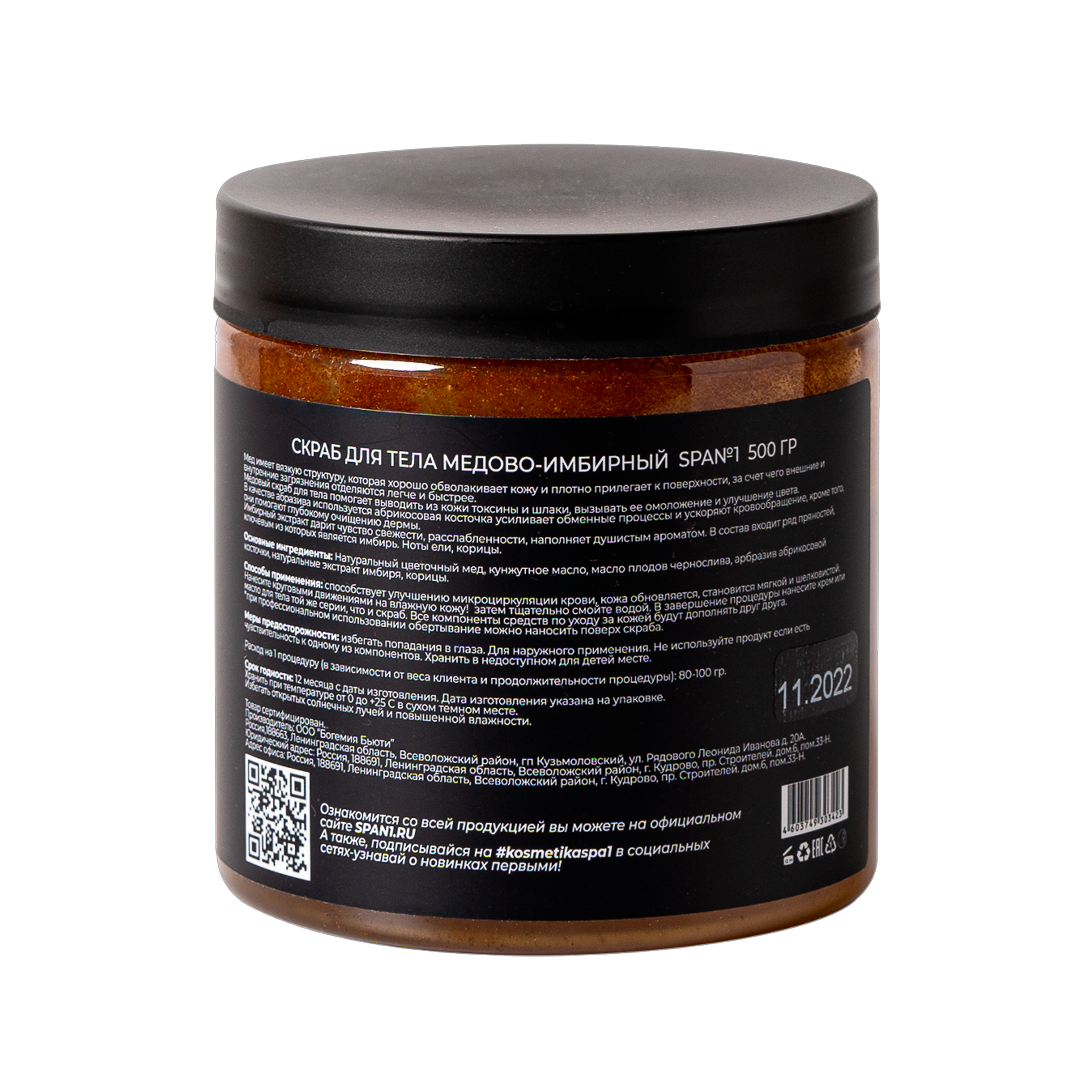 Основные ингредиенты: Натуральный цветочный мед, кунжутное масло, масло плодов чернослива, абразив абрикосовой косточки, натуральные экстракт имбиря, корицы.